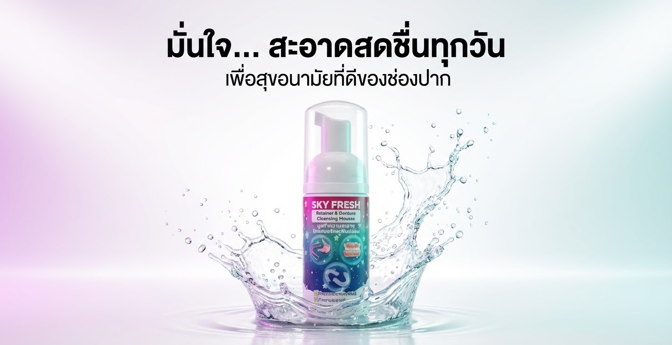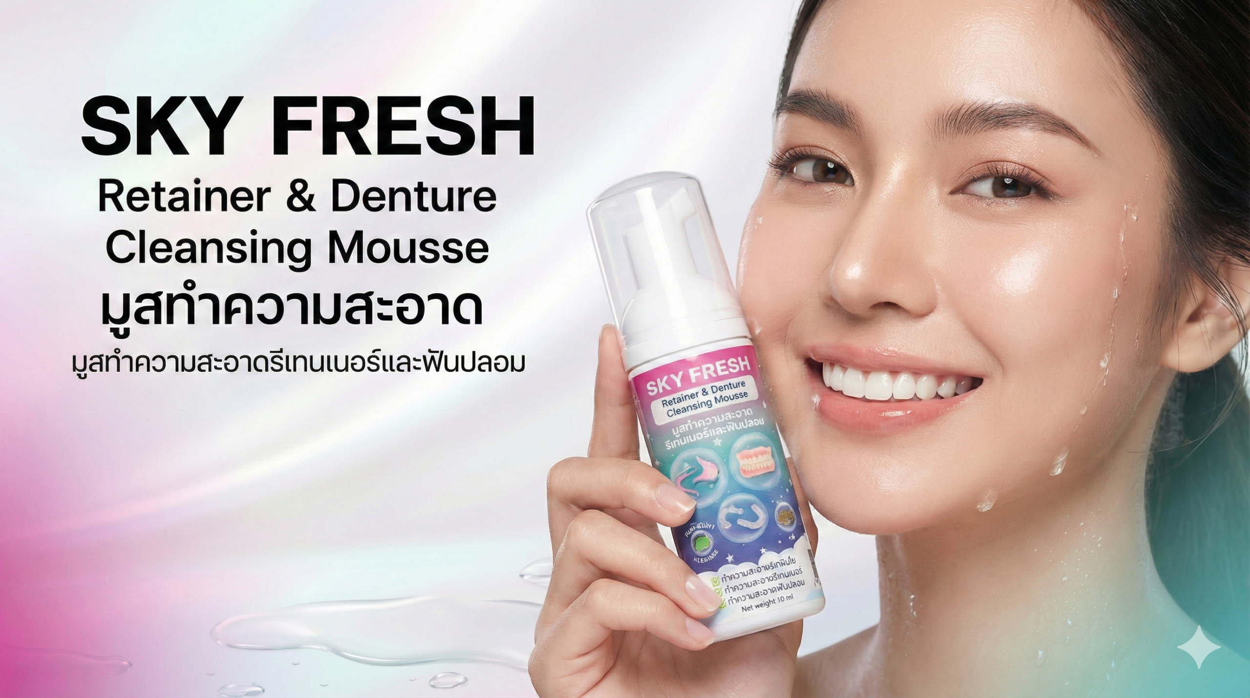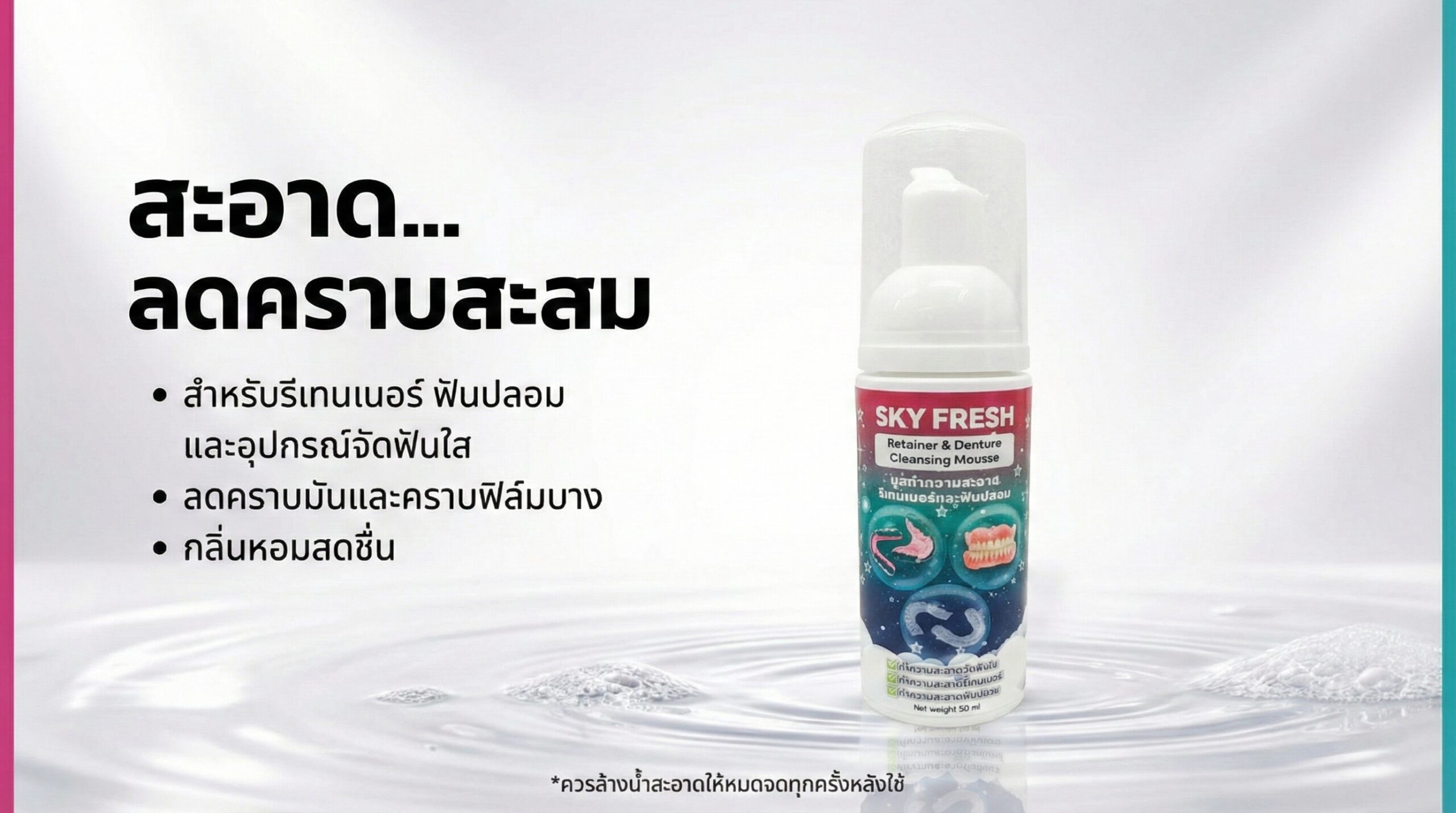 Sky Fresh Retainer & Denture Cleansing Mousse คือมูสโฟมทำความสะอาดชิ้นงานถอดได้ สำหรับรีเทนเนอร์ ฟันปลอม และเฝือกสบฟัน โดยออกแบบให้การดูแล สั้น ง่าย และทำได้เป็นประจำทุกวัน ด้วยแนวทางใช้งานง่าย: กดมูสโฟม → แปรงขนนุ่ม → ล้างน้ำสะอาด