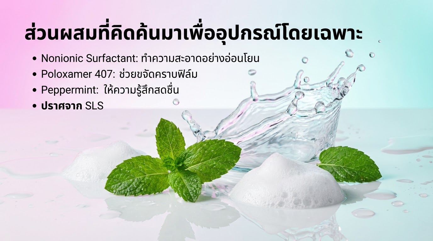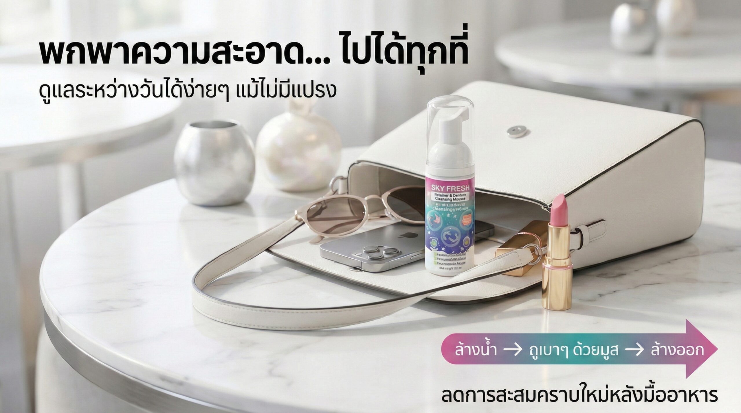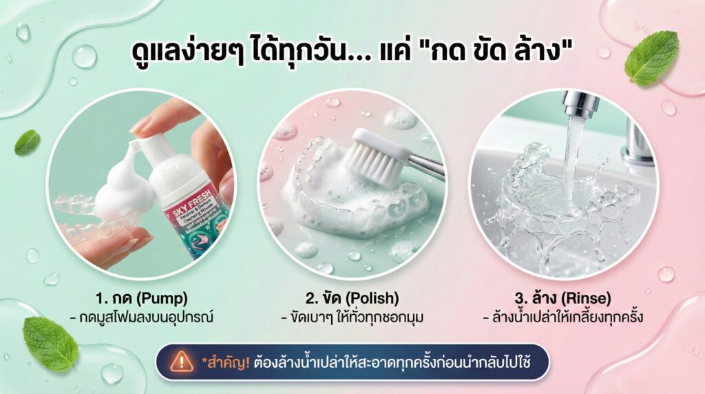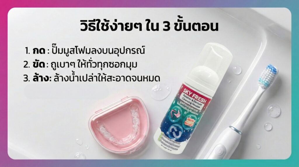 Sky Fresh Retainer & Denture Cleansing Mousse คือมูสโฟมทำความสะอาดชิ้นงานถอดได้ สำหรับรีเทนเนอร์ ฟันปลอม และเฝือกสบฟัน โดยออกแบบให้การดูแล สั้น ง่าย และทำได้เป็นประจำทุกวัน ด้วยแนวทางใช้งานง่าย: กดมูสโฟม → แปรงขนนุ่ม → ล้างน้ำสะอาด